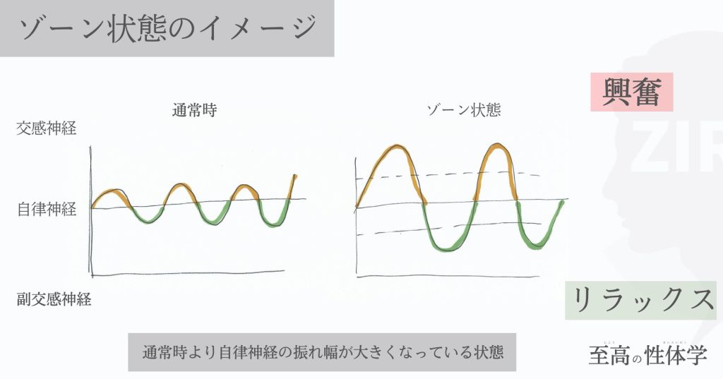 交感神経(興奮)、副交感神経(リラックス)の波を大きくすることで、ホルモンが大量分泌され、リラックスしながらも感覚が研ぎ澄まされるような、そんな状態になるわけです。